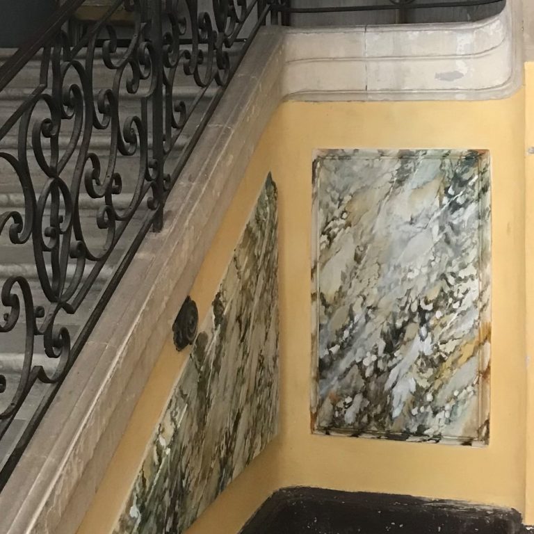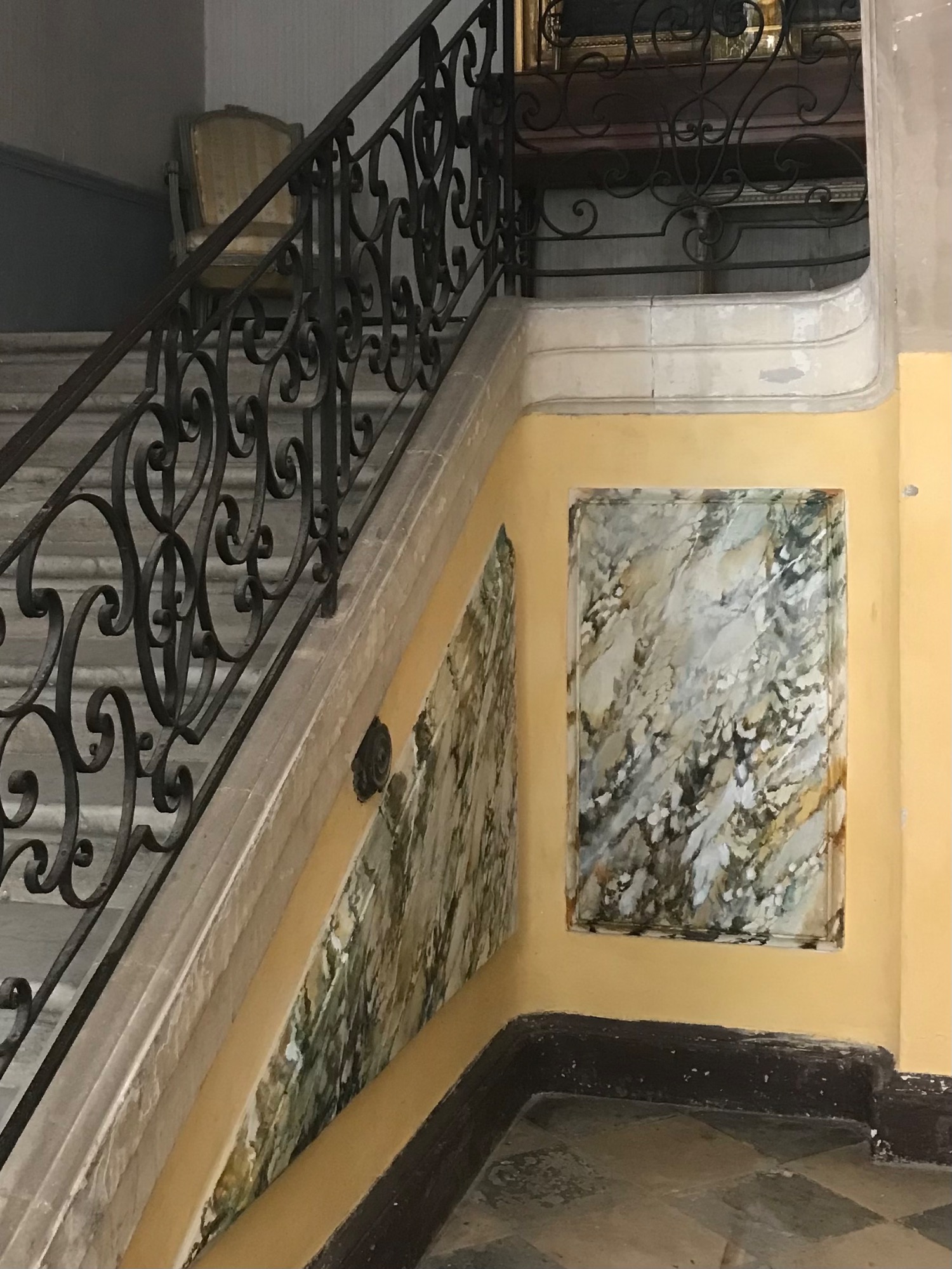 Dans un hôtel particulier provençal, inspiré du jaune de sienne et de la brèche violette, ce marbre sur mesure a été choisi pour que les matériaux et les couleurs de cette cage d’escalier se fusionnent entre eux par une touche de fantaisie.